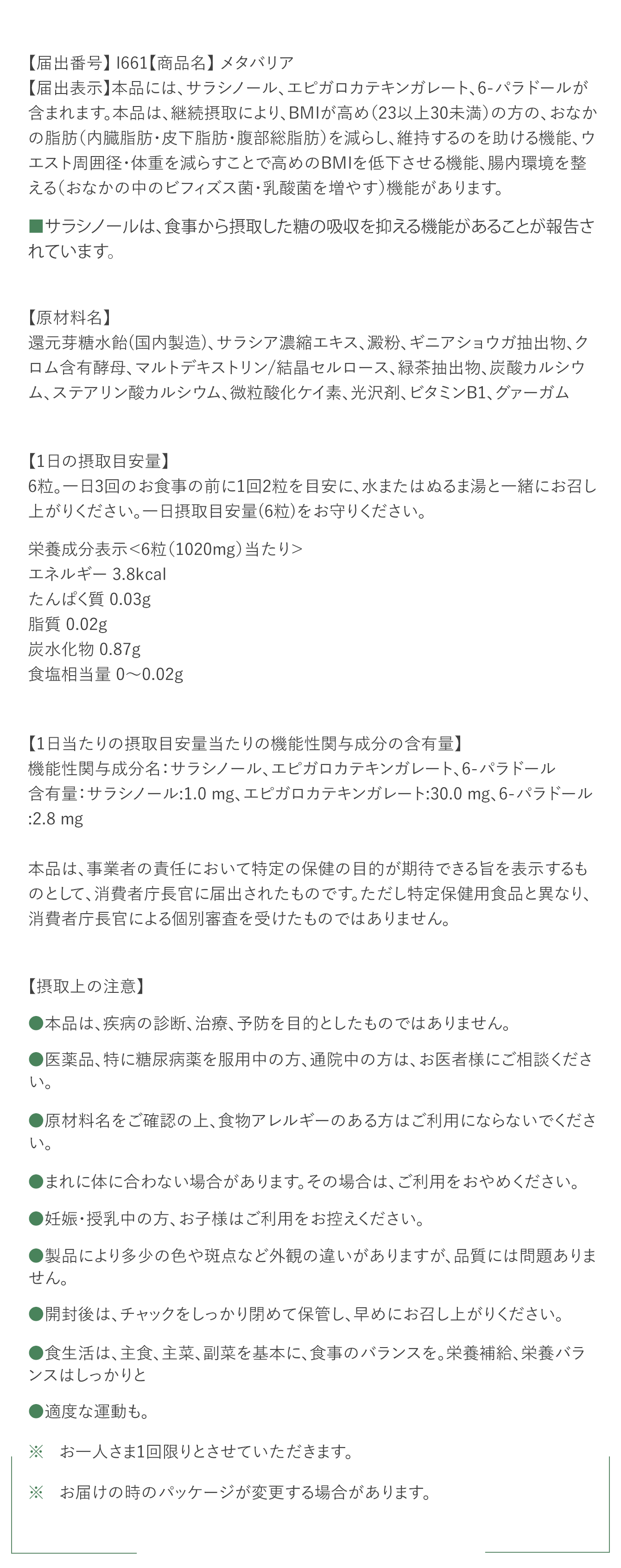 一日摂取目安量(6粒)をお守りください。