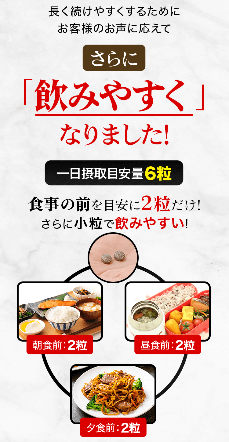 一日3回のお食事の前に1回2粒を目安に、水またはぬるま湯と一緒にお召し上がりください。