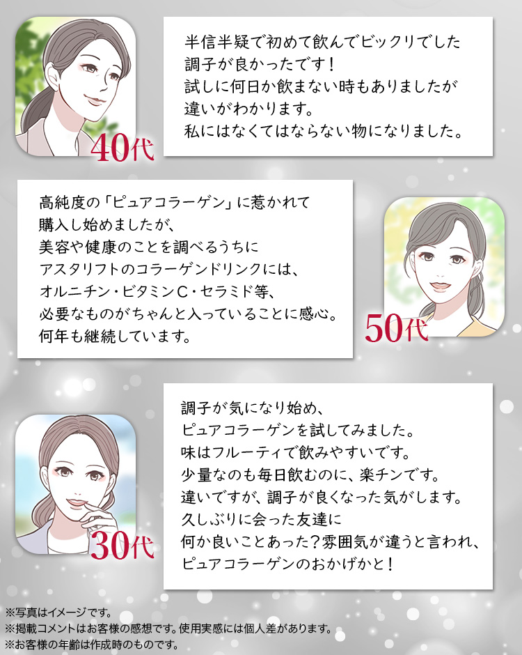 ※3 富士フイルム調べ 定期のお客様アンケート2019年11月28日~2019年12月4日実施 n=57名(20代~70代女性)回答者57名のうち「ぜひ続けて飲みたい」「続けて飲みたい」「まあ続けたい」と回答した人が93.0%