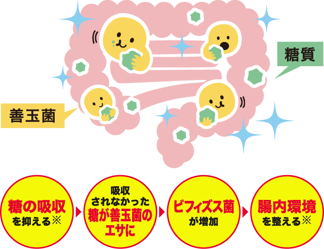 吸収されなかった糖は善玉菌(ビフィズス菌)のエサとなり、善玉菌(ビフィズス菌)が増加するため、それがおなかの調子の変化として現れることがあるのです。※糖の吸収を抑える機能性と、継続摂取により腸内環境を整える(おなかの中のビフィズス菌を増やす)機能性は機能性関与成分サラシノールによる研究レビュー