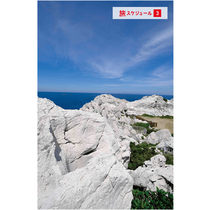 海の青と石灰岩の白のコントラストが幻想的。石灰岩は2億5000万年以上前のもので、その風景は「日本のエーゲ海」と呼ばれています。