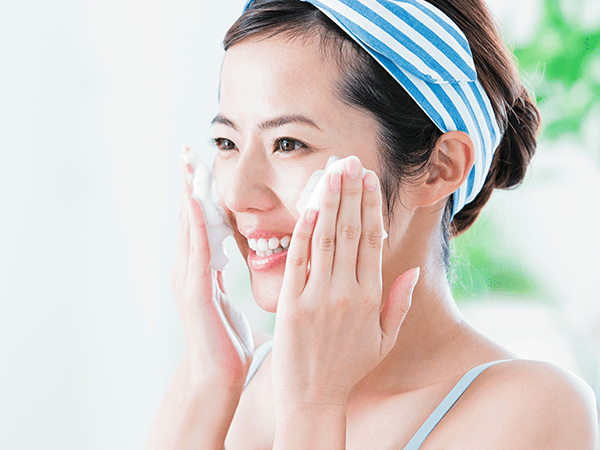 まず、洗顔前にクレンジング剤できちんとメイクを落とします。次に洗顔です。洗顔は丁寧かつ短時間で行うのが理想です。大切なのは肌をこすらないこと。刺激を与えずたっぷりの泡でやさしく洗ってください。髪の生え際やあごのラインなどに、洗い残しやゆすぎ残しがないよう気をつけます。