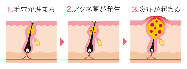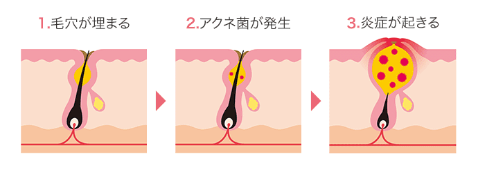 ニキビは医学用語で「尋常性痤瘡(じんじょうせいざそう)」と呼ばれる、毛穴の病気です。ニキビができてしまう仕組みを簡単に説明すると「毛穴が詰まる→皮脂がたまりアクネ菌が活性→炎症が起こる」という3ステップになります。